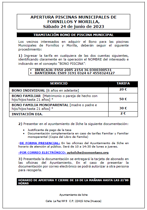 El Ayuntamiento de Ilche ya ha abierto las piscinas de Morilla y Fornillos tras solventar los problemas acaecidos por las tormentas. Las piscinas permanecerán abiertas hasta finales de agosto.