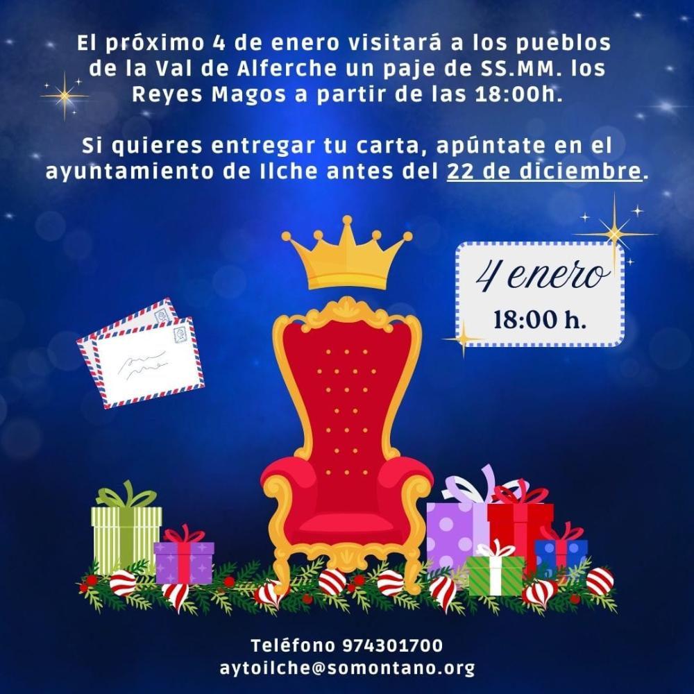 Desde el Ayuntamiento de Ilche se informa a todos los vecinos y vecinas que el próximo 4 de enero, domingo, el Paje de los Reyes Magos, recorrerá las localidades de la Val D'Alferche recogiendo todas las cartas de niñas y niños que la hayan escrito.
