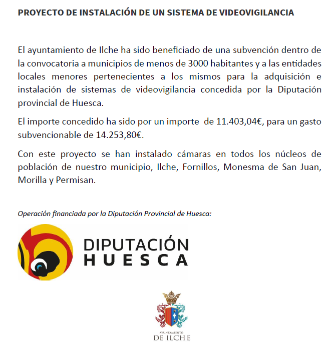 Para esta actuación, el Ayuntamiento ha contado con una subvención de la Diputación Provincial de Huesca dentro de la convocatoria a municipios de menos de 3000 habitantes y a las entidades locales menores pertenecientes a los mismos para la adquisición e instalación de sistemas de videovigilancia concedida por la Diputación provincial de Huesca.