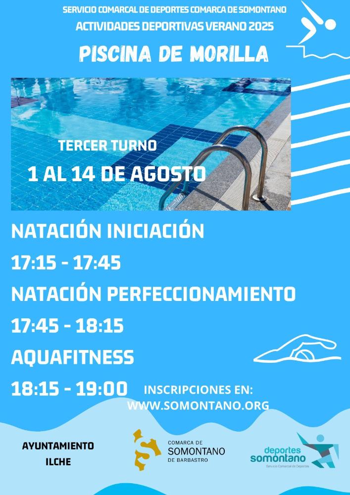 La primera quincena del mes de agosto, concretamente desde el día 1 de agosto al 14, tendrá lugar el tercer turno de las actividades acuáticas y cursos de natación en las piscinas municipales de Morilla.